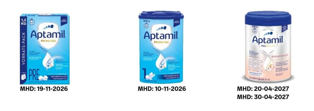 - Aptamil Profutura Pre D (800g): تاريخ صلاحية 20-04-2027 و30-04-2027.