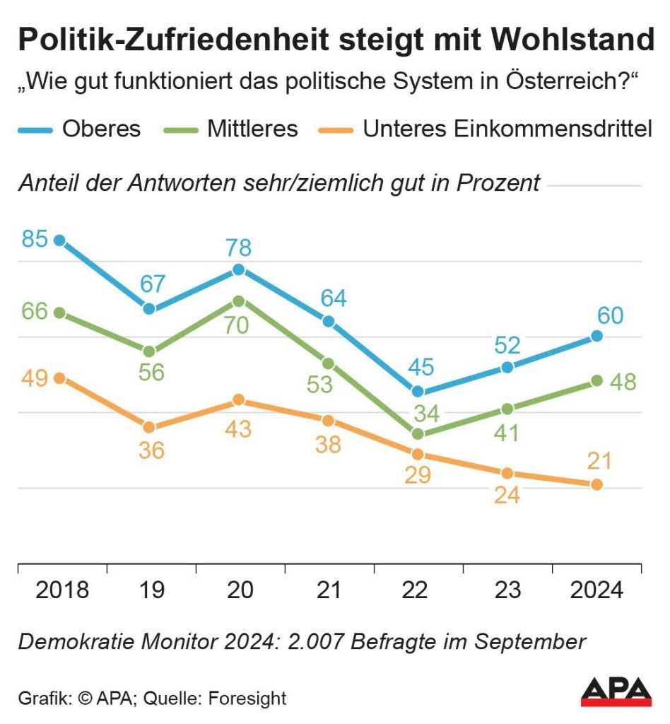 وبحسب وكالة الأنباء النمساوية (APA)، رغم التحسن العام، فإن الفجوة بين الطبقات الاجتماعية في تقييم النظام السياسي أصبحت أكبر من أي وقت مضى. في حين يرى 60% من الأفراد في الطبقة العليا و48% في الطبقة المتوسطة أن النظام السياسي يعمل جيدًا، فإن هذه النسبة لا تتجاوز 21% في الطبقة الدنيا. ومع ذلك، فإن الرضا في الطبقات العليا والمتوسطة قد ارتفع للسنة الثانية على التوالي، في حين انخفض في الطبقة الدنيا منذ عام 2020، عندما كان 43% من هذه الفئة يعتبرون النظام السياسي جيدًا.