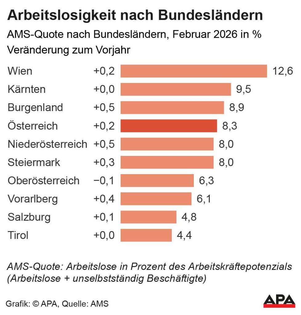أظهرت البيانات الصادرة عن مؤسسة سوق العمل (AMS)، اليوم الاثنين، استقراراً نسبياً في وضع التوظيف خلال شهر فبراير/شباط، حيث سجلت أعداد العاطلين عن العمل زيادة طفيفة كانت أقل حدة مما كانت عليه في الأشهر السابقة، وسط مؤشرات متباينة بين الولايات والمقاطعات النمساوية، بحسب وكالة الأنباء النمساوية (APA).