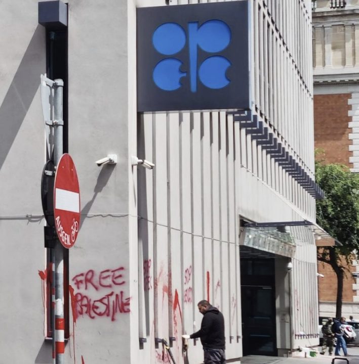 وشارك في المسيرة عشرات المتظاهرين الذين مرّوا عبر وسط المدينة، وتحوّلت المظاهرة إلى مشهد فوضوي بعد أن أقدم مجهولون على تشويه واجهة مبنى أوبك في شارع Helferstorferstraße بشعارات من قبيل “Free Palestine”.
