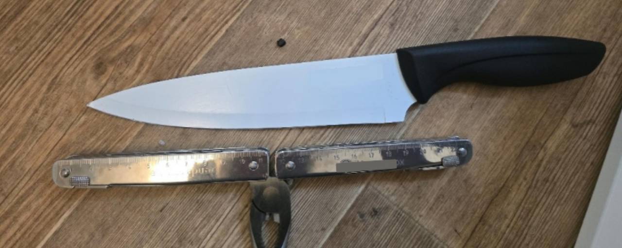 ووجهت له تهمة التهديد الخطير، كما تم ضبط سكين المطبخ المستخدم في الحادث، والذي يبلغ طول نصل شفرتها حوالي 20 سنتيمتراً، داخل الشقة.