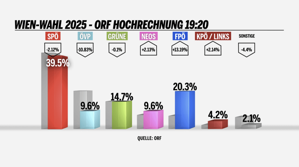 شهدت مدينة فيينا اليوم انتخابات بلدية، حيث أظهرت أولى التقديرات الفورية للنتائج، والتي أعدها معهد Foresight لصالح وكالة الأنباء النمساوية APA وهيئة الإذاعة النمساوية ORF، أن حزب الاشتراكيين الديمقراطيين النمساوي SPÖ حافظ على المركز الأول مع تسجيل خسائر طفيفة.