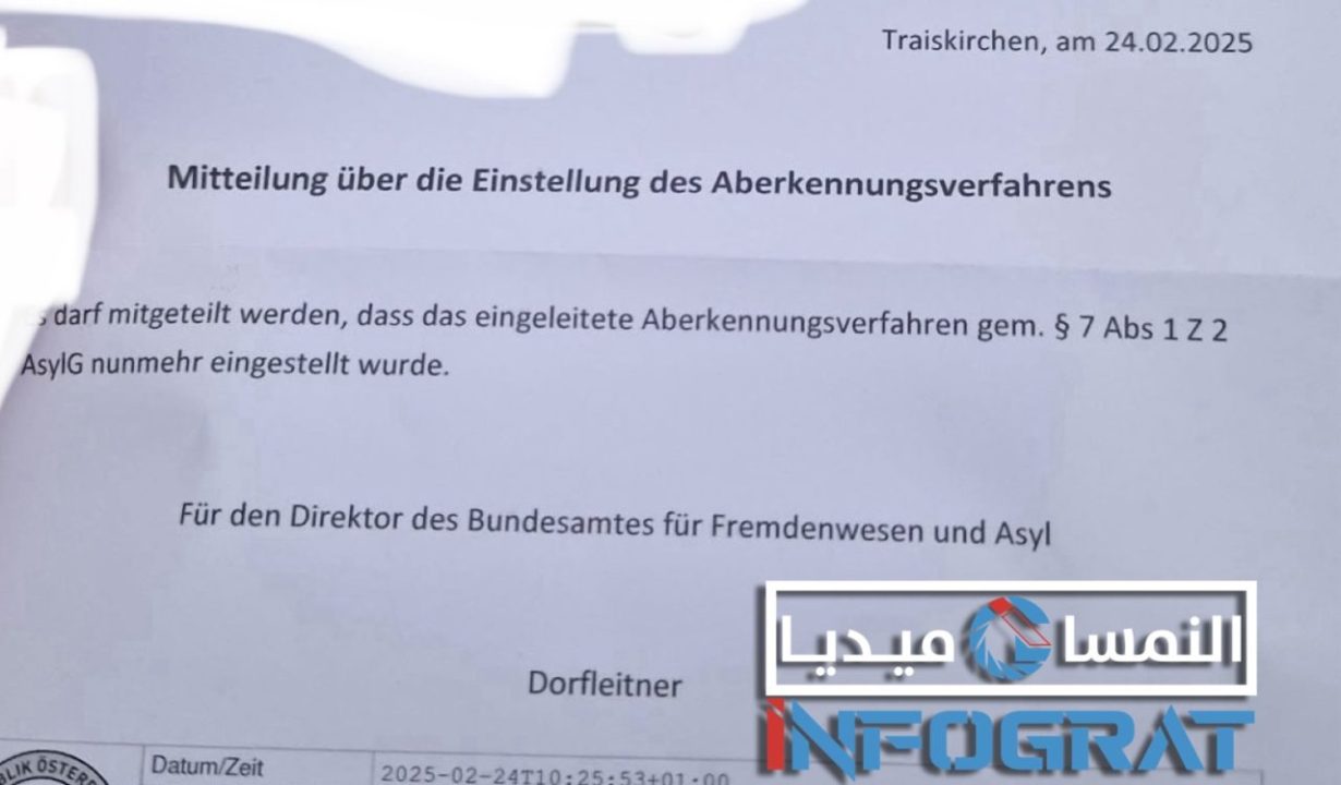 في تطور جديد بشأن سياسات اللجوء، أرسلت سلطات اللجوء النمساوية بلاغات رسمية لبعض اللاجئين السوريين تفيد بإيقاف إجراءات سحب صفة اللجوء التي كانت قد بدأت بحقهم سابقًا، ووفقًا للوثائق الصادرة عن المكتب الاتحادي للهجرة واللجوء (BFA)، والذي حصلت INFOGRAT على نسخة منها، فقد تم تعليق أو إنهاء إجراءات إلغاء اللجوء استنادًا إلى المادة 7، الفقرة 1، البند 2 من قانون اللجوء النمساوي (AsylG).