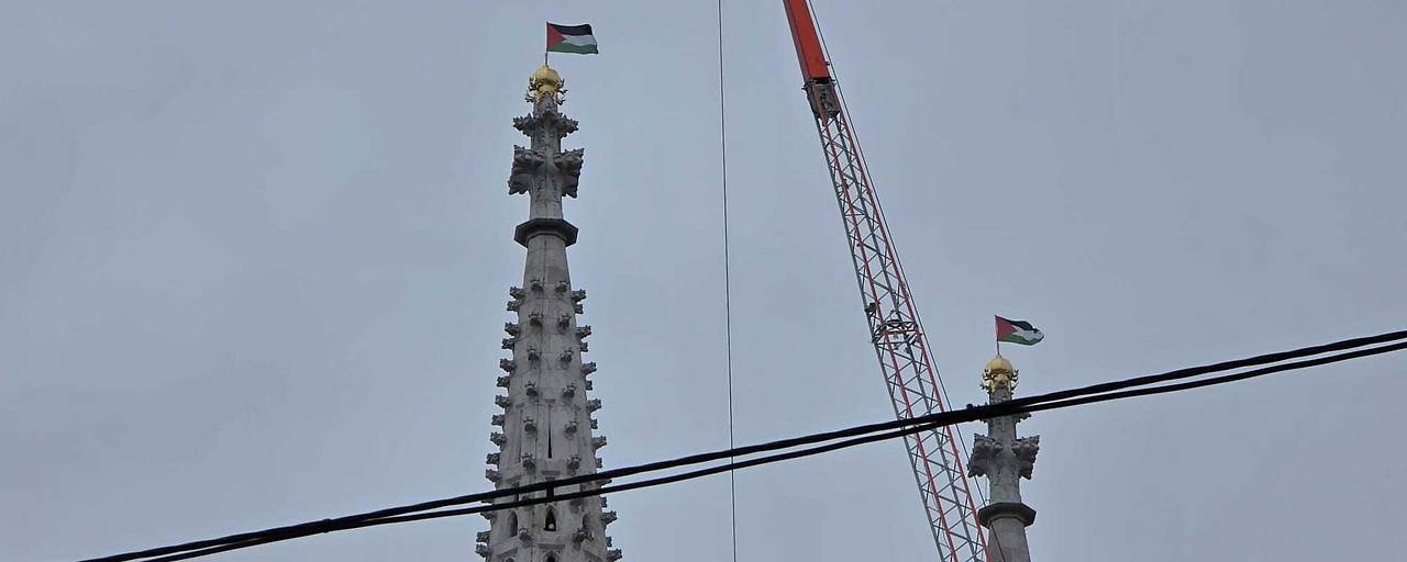 بعد ثلاثة أيام.. رافعة تزيل أعلام فلسطينية رُفعت على كنيسة “Votivkirche” وسط العاصمة النمساوية فيينا