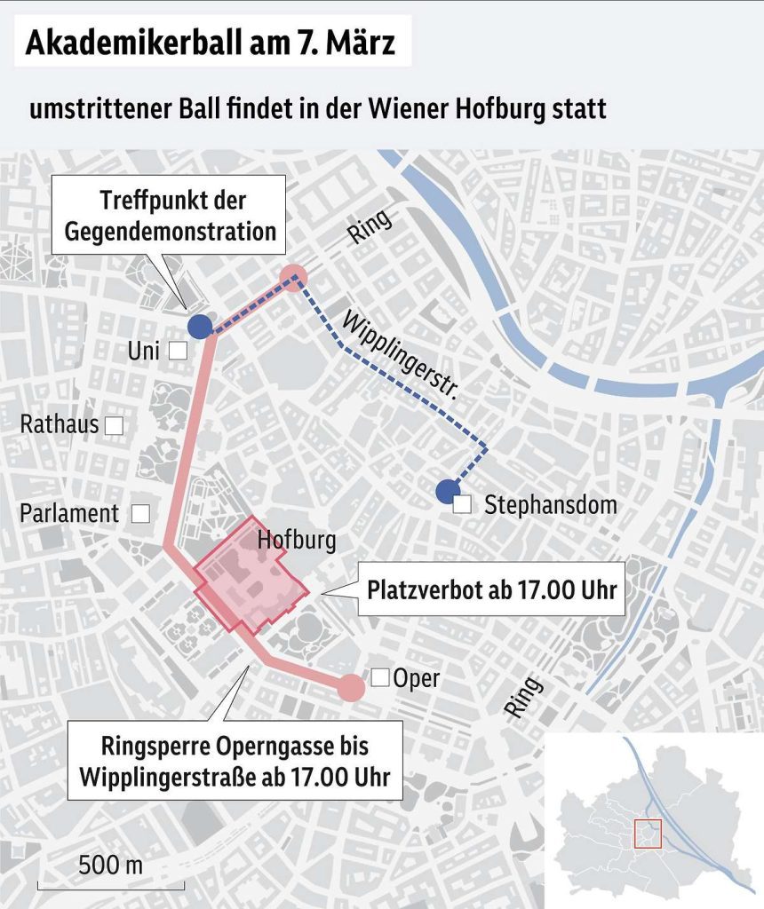 تشهد مدينة فيينا، مساء الجمعة، إغلاقًا جزئيًا لشوارع وسط المدينة بسبب احتجاجات ومظاهرات ضد (Akademikerball)، الذي ينظمه حزب الحرية النمساوي (FPÖ) في قصر (Hofburg) وأعلنت الشرطة فرض حظر على التجمّع في ميدان (Heldenplatz)، بالإضافة إلى إغلاق أجزاء من شارع (Ringstraße) أمام حركة المرور.