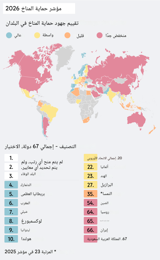 تصدرت الدنمارك مؤشر حماية المناخ CCPI 2026 مرة أخرى، تلتها بريطانيا ثم المغرب. وكالمعتاد، بقيت المراتب الثلاث الأولى شاغرة، حيث يرى واضعو التقرير أنه لا توجد أي دولة تعتبر نموذجية بما يكفي في جهود حماية المناخ.