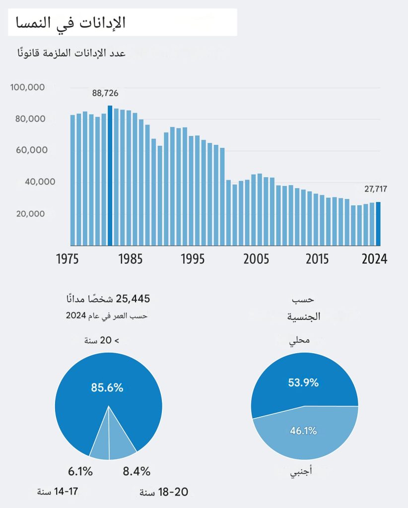 على المدى الطويل، يتناقص عدد الإدانات القضائية. فبينما صدرت أحكام نهائية بحق 38,763 مجرماً ومجرمة في عام 2001، انخفض هذا العدد إلى 27,717 في العام الماضي، أي ما يقرب من الثلث، على الرغم من أن عدد السكان قد ازداد منذ ذلك الحين بنحو 1.1 مليون نسمة.