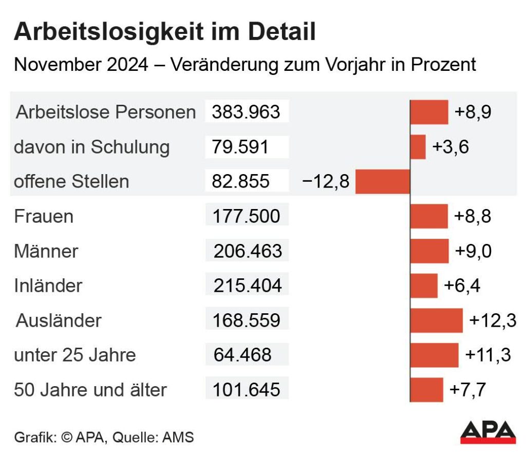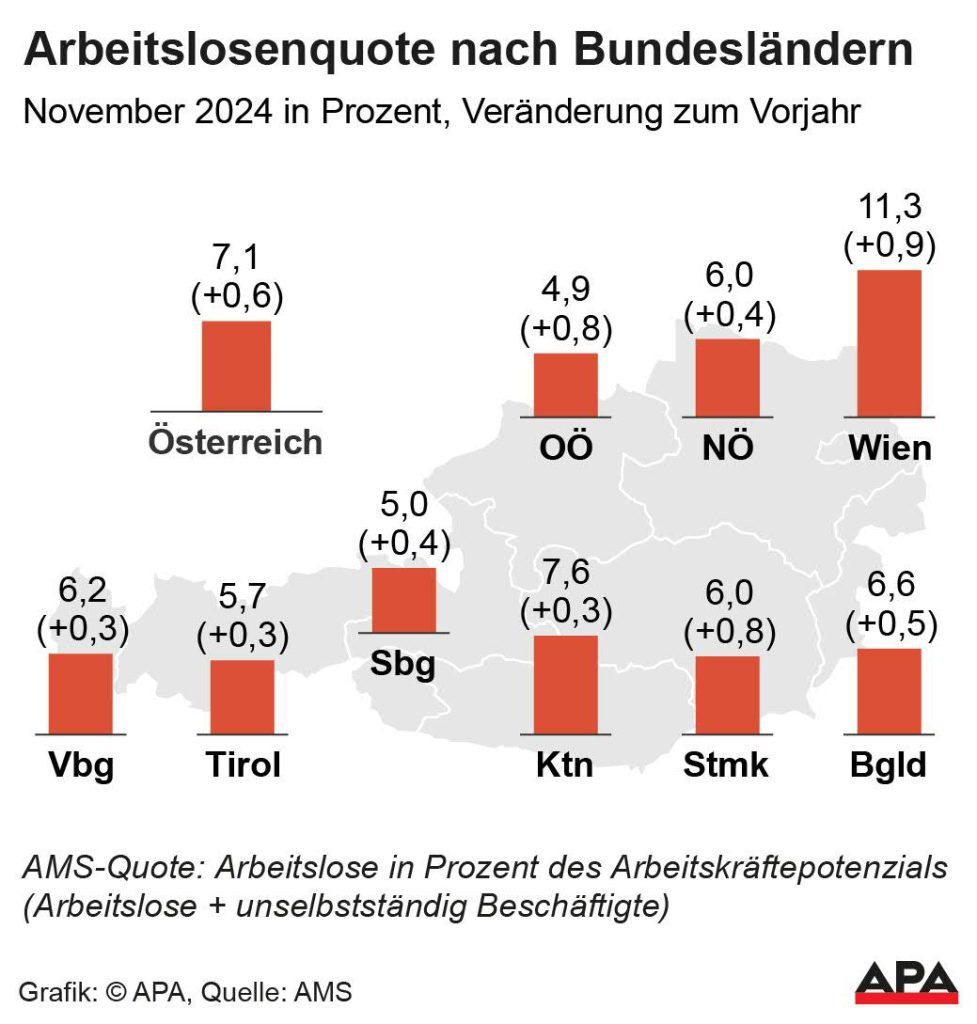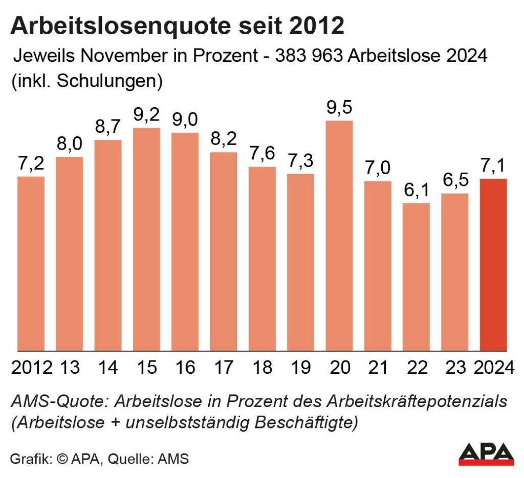 بحلول نهاية نوفمبر 2024، كان نحو 384.000 شخص مسجلين كعاطلين عن العمل أو في برامج تدريبية لدى وكالة سوق العمل النمساوي (AMS)، بزيادة تقدر بنحو 31.400 شخص، أي بنسبة 8.9% مقارنة بالشهر نفسه من العام الماضي. وارتفعت نسبة البطالة إلى 7.1%، بزيادة قدرها 0.6 نقطة مئوية عن العام السابق، وفقًا لما أعلنته وزارة العمل والاقتصاد يوم الاثنين.