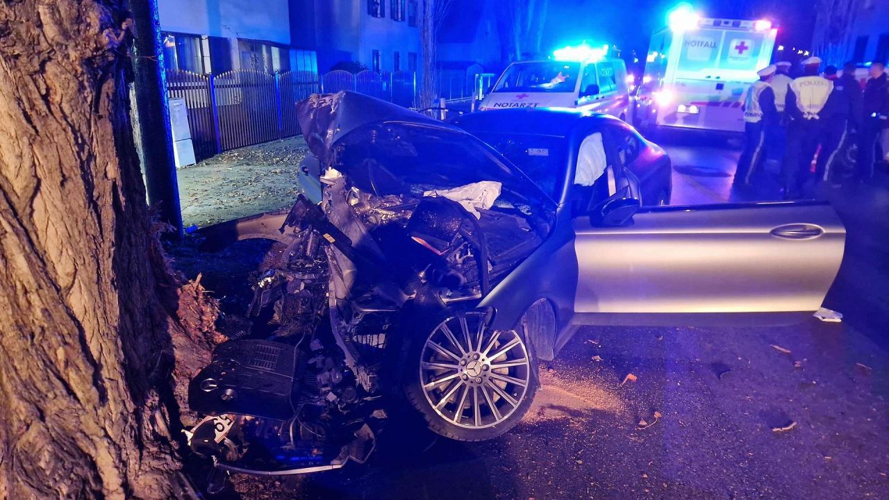 عند المبنى رقم 26 في Kapellenstraße، فقد السائق السيطرة على المركبة واصطدم بشجرة قبل أن يفرّ هاربًا سيرًا على الأقدام، تاركًا الراكب المصاب خلفه.
