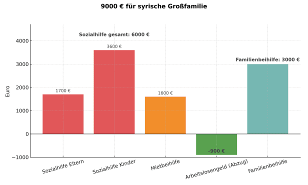 وكشفت صحيفة „profil“ النمساوية، عن تفاصيل مثيرة للجدل تتعلق بحصول عائلة سورية مكونة من الأب والأم وأحد عشر طفلًا، على مبلغ 9000 يورو شهريًا كمساعدات حكومية في العاصمة فيينا، رغم أنهم يعيشون في شقة تقل مساحتها عن 100 متر مربع، أي بمعدل يقارب 7 أمتار مربعة لكل فرد، وأعادت الصحيفة تسليط الضوء على تركيبة هذا المبلغ، التي تجمع بين المساعدات الاجتماعية (Sozialhilfe)، وإعانات البطالة (Arbeitslosengeld)، ودعم الإيجار (Mietbeihilfe)، وإعانة الأسرة (Familienbeihilfe).