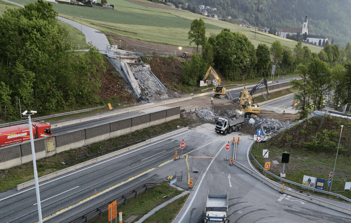 جرى تفجير جسر فوق الطريق السريع قرب فومب بنجاح خلال الليل، فوق الطريق السريع إينتال (Inntalautobahn – A12) عند منطقة محطة استراحة فومب (Raststation Vomp) في تيرول، بنجاح، حيث جرى هدمه بالكامل. وعلى الرغم من أن الأعمال استغرقت وقتًا أطول مما كان مخططًا له، فقد تم إتمامها خلال ليلة واحدة. وفي هذه العملية، تم تفجير الجسر بدلًا من تفكيكه ميكانيكيًا.