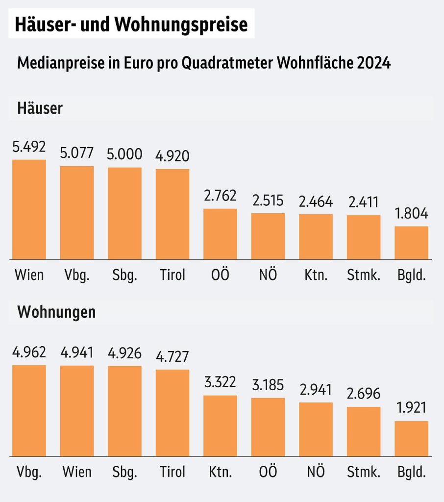 أظهر التقرير أن الفروقات السعرية بين الولايات النمساوية أصبحت أكثر وضوحاً، مع تسجيل فورآرلبرغ (Vorarlberg) وفيينا (Wien) وسالزبورغ (Salzburg) أعلى الأسعار لكل من الشقق والمنازل، بينما كانت بورغنلاند (Burgenland) وشتايرمارك (Steiermark) الأرخص.