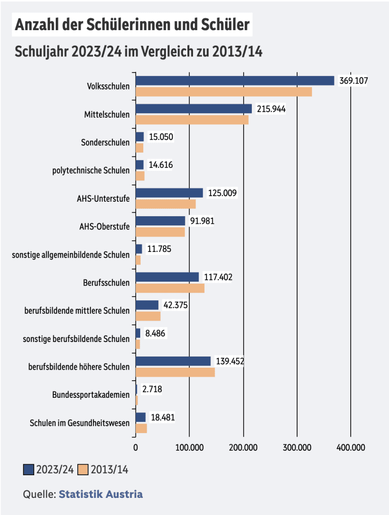 بينما شهدت المدارس المتوسطة (Mittelschulen) ومدارس التعليم العام العالي (AHS) في مرحلتها الدنيا زيادات جديدة، وُجد أن المدارس المهنية المتوسطة (BMS) والمدارس المهنية العليا (BHS) سجلت انخفاضات ملحوظة على مدى العقد الماضي. الاستثناء الوحيد كان في مؤسسات التعليم الابتدائي والاجتماعي التي شهدت زيادة بنسبة 5.4%.