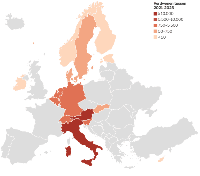 تصدرت إيطاليا القائمة بـ22,899 حالة، تلتها النمسا بـ20,077، ثم بلجيكا بـ2,241، وألمانيا بـ2,005 حالة.