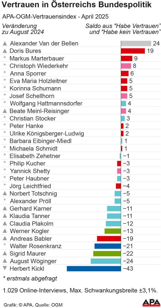 تصدّر رئيس الجمهورية ألكسندر فان دير بيلن (Alexander Van der Bellen) مجدداً مؤشر الثقة الجديد (APA/OGM-Vertrauensindex) الذي يقيس ثقة المواطنين النمساويين في السياسيين، فيما جاء وزير المالية ماركوس مارترباور (Markus Marterbauer) من الحزب الاشتراكي الديمقراطي (SPÖ) كأكثر أعضاء الحكومة الجديدة ثقةً بين المواطنين.