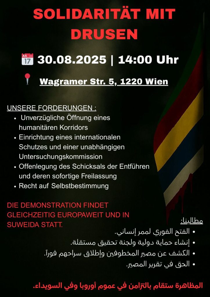 شهدت العاصمة النمساوية فيينا مساء السبت 30 أغسطس/آب 2025 وقفة احتجاجية أمام مقر منظمة الأمم المتحدة، دعت إليها جمعية “جسور للثقافة والاندماج وحقوق الإنسان” في النمسا، بمشاركة ناشطين من الطائفة الدرزية والأكراد والعلويين، وجاءت هذه الوقفة في إطار فعاليات تضامنية متزامنة نظمت في عدة مدن أوروبية وفي محافظة السويداء السورية.