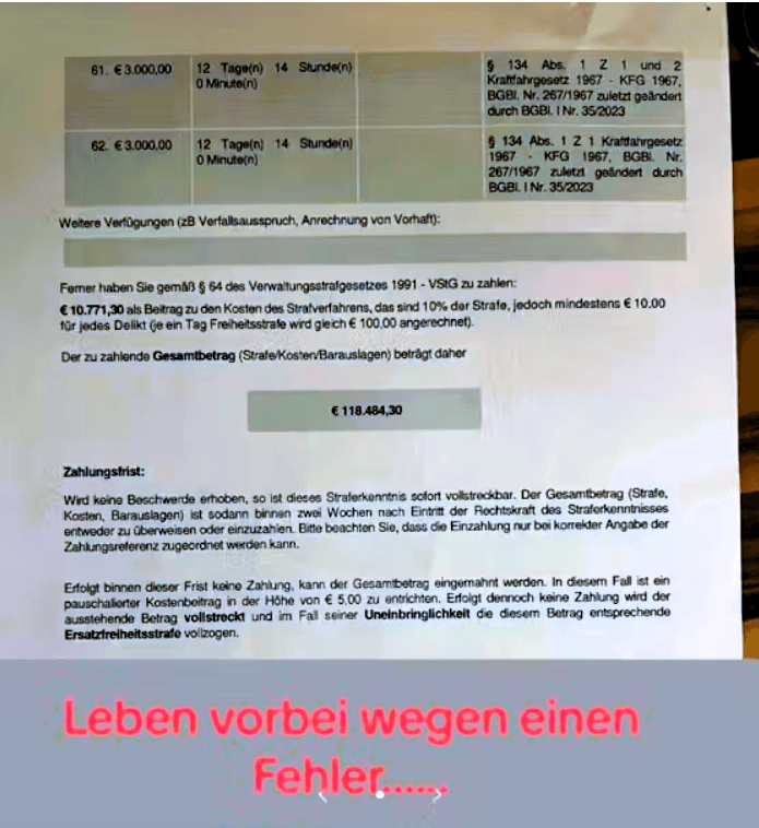 وحسب موقع Heute، الشاب، الذي يمتلك دراجة نارية، تورط في مطاردة مع الشرطة امتدت عبر عدة مناطق مختلفة في فيينا، وقد تم توجيه له 62 تهمة في هذا السياق، بالإضافة إلى تكاليف الإجراءات القانونية، فإن إجمالي المبلغ الذي يجب عليه دفعه يبلغ 118,484.30 يورو!