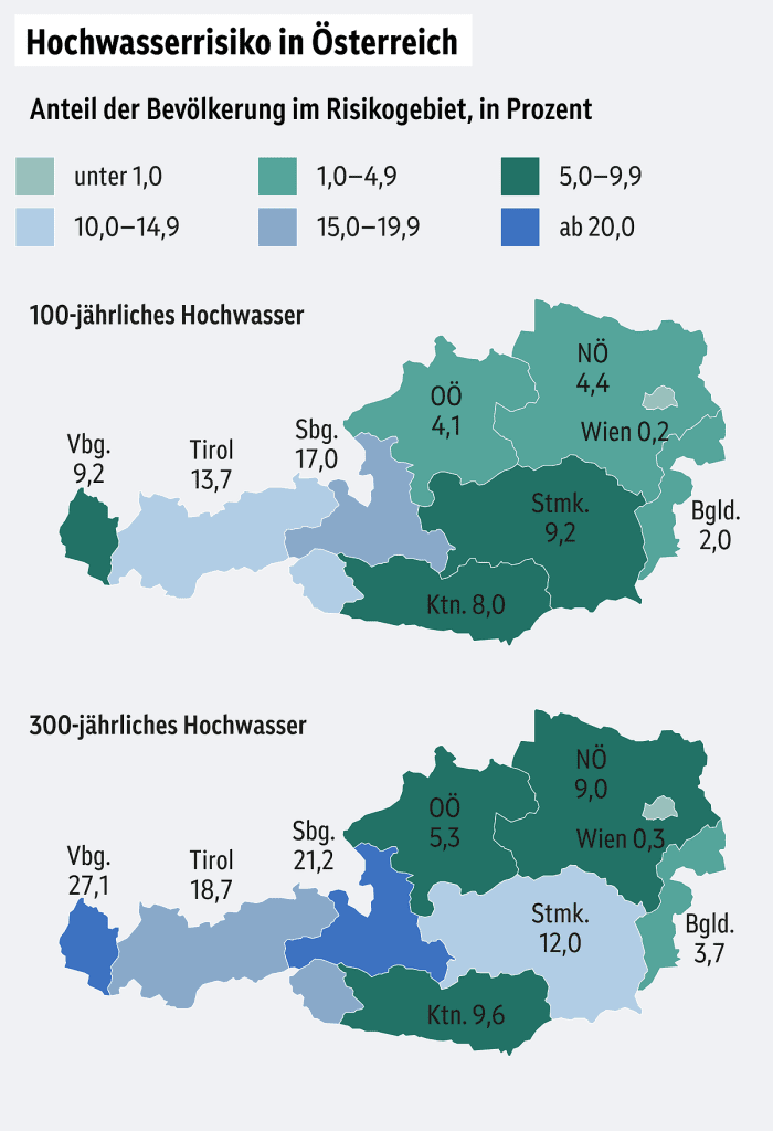 تتركز أعلى نسبة من السكان المعرضين لمخاطر الفيضانات في المناطق الجبلية، حيث يعيش 17% من سكان Salzburg و14% من سكان Tirol ضمن مناطق الفيضانات التي تحدث كل 100 عام. كما سجلت قرى مثل Kalwang في Steiermark أعلى معدلات الخطورة، حيث يعيش 9 من كل 10 سكان في مناطق مهددة.