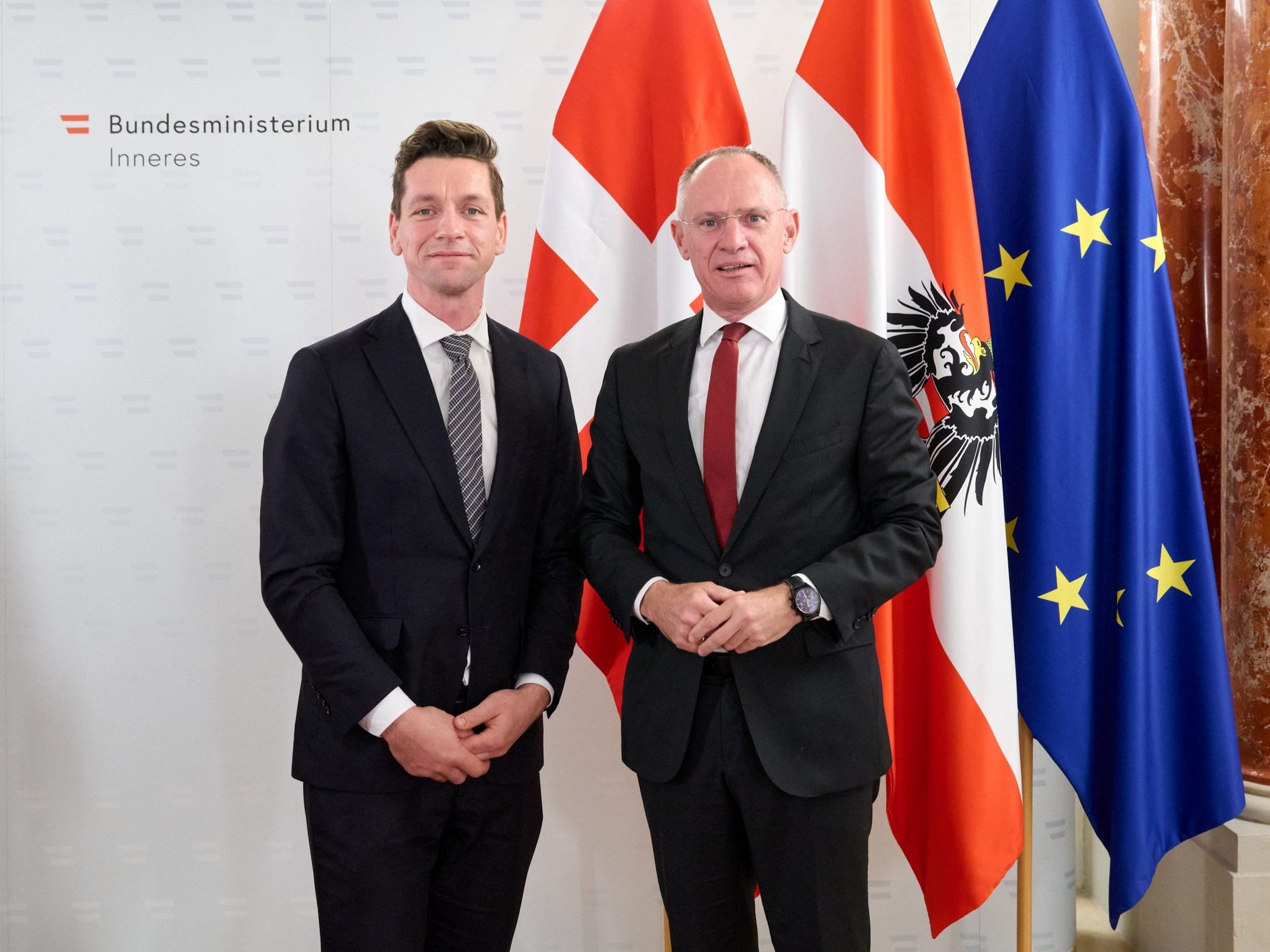 اجتمع وزير الداخلية النمساوي جيرهارد كارنر مع نظيره الدنماركي كاري ديبفاد بيك اليوم لمناقشة تعزيز التعاون في مجال الهجرة، مع التركيز على آليات جديدة للعمل مع دول ثالثة آمنة، كما ناقشا الترتيبات الخاصة بقمة الهجرة الدولية المقرر عقدها في كوبنهاجن في 6 مايو المقبل.