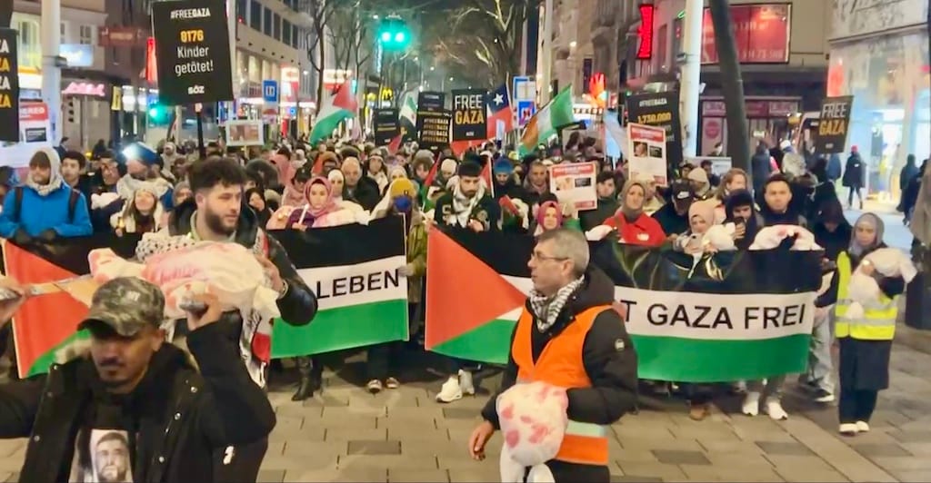 وحمل المتظاهرون أعلام فلسطين وساروا في الأحياء التجارية الرئيسية في فيينا، حاملين شموعًا ومجسمات تمثل جثامين ضحايا الأطفال في غزة.