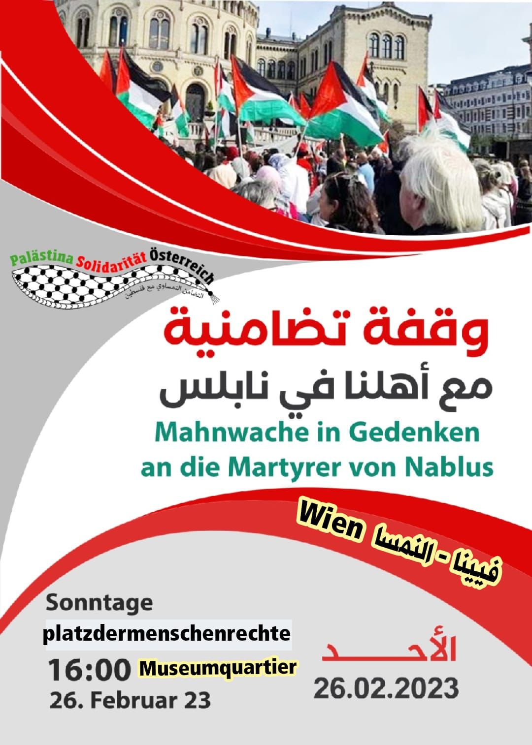 أعلنت جمعيات عربية في فيينا عن وقفة تضامنية مع نابلس في ساحة platzdermenschenrechte، تقام يوم الأحد، 26-2-2023، عند تمام الساعة الرابعة مساءً.