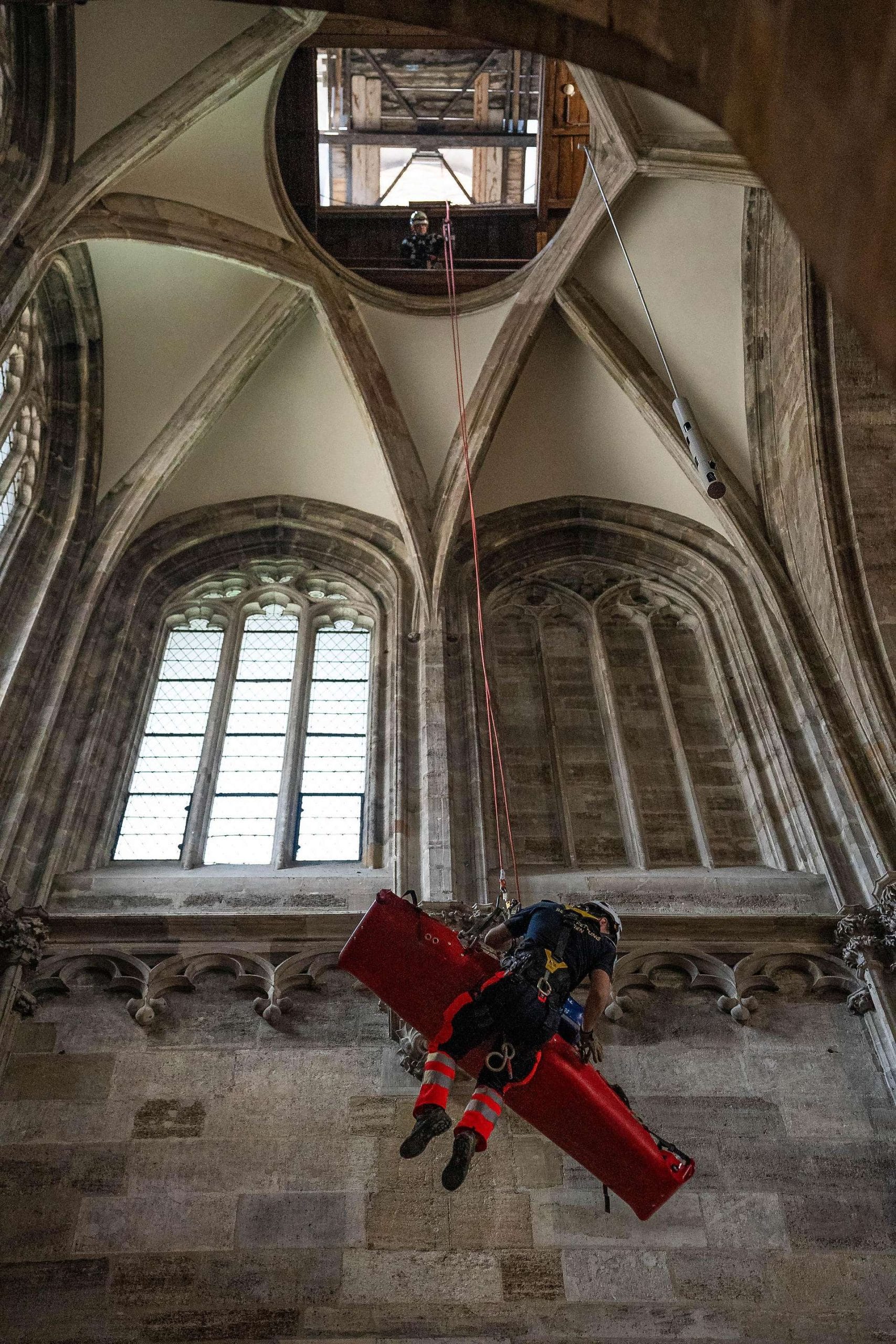 تعاونت فرق الإنقاذ من كل من إدارة الإطفاء في فيينا وجمعية الإنقاذ في عملية إنقاذ السائح، وقام فريق الإنقاذ من إدارة الإطفاء بتثبيت نقطة ربط في البرج، بينما قام فريق تقنيات الحبال من جمعية الإنقاذ بإنزال السائح برفقة المسعفين على نقالة خاصة.