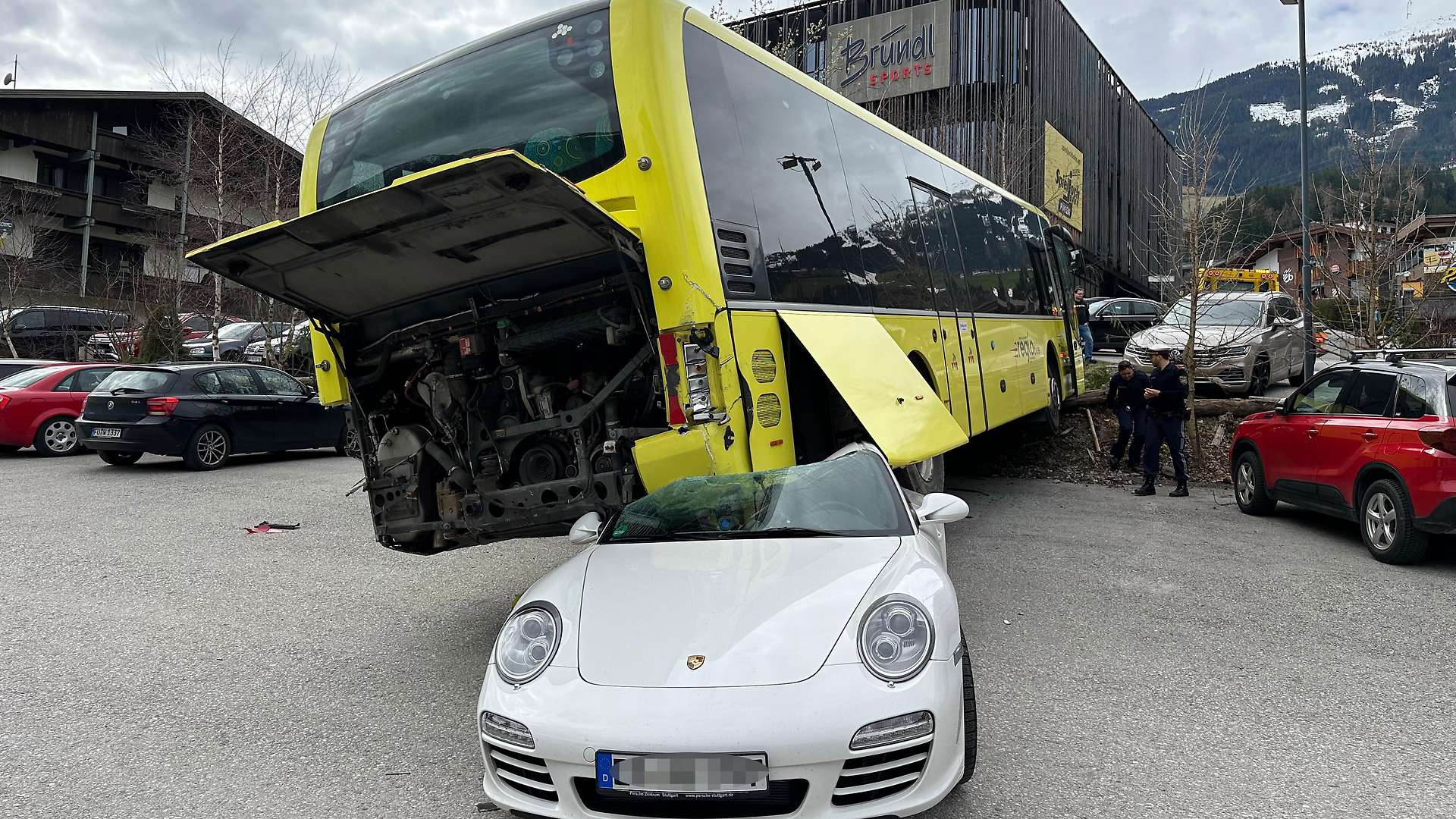 حافلة تسير دون سائق تصطدم بعدة سيارات وتستقر على سقف سيارة بورشه في تيرول