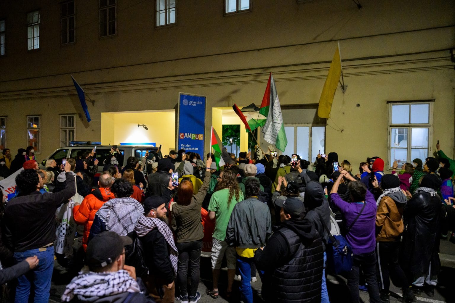 في عملية ليلية، قامت الشرطة بإخلاء مخيم احتجاجي مؤيد لفلسطين أقيم في حرم جامعة فيينا، وتم توقيف عدد من المتظاهرين، وجاء هذا القرار بعد أن شهدت المحتجّات تطرفًا في محتواها لم يعد يتوافق مع القانون النمساوي.