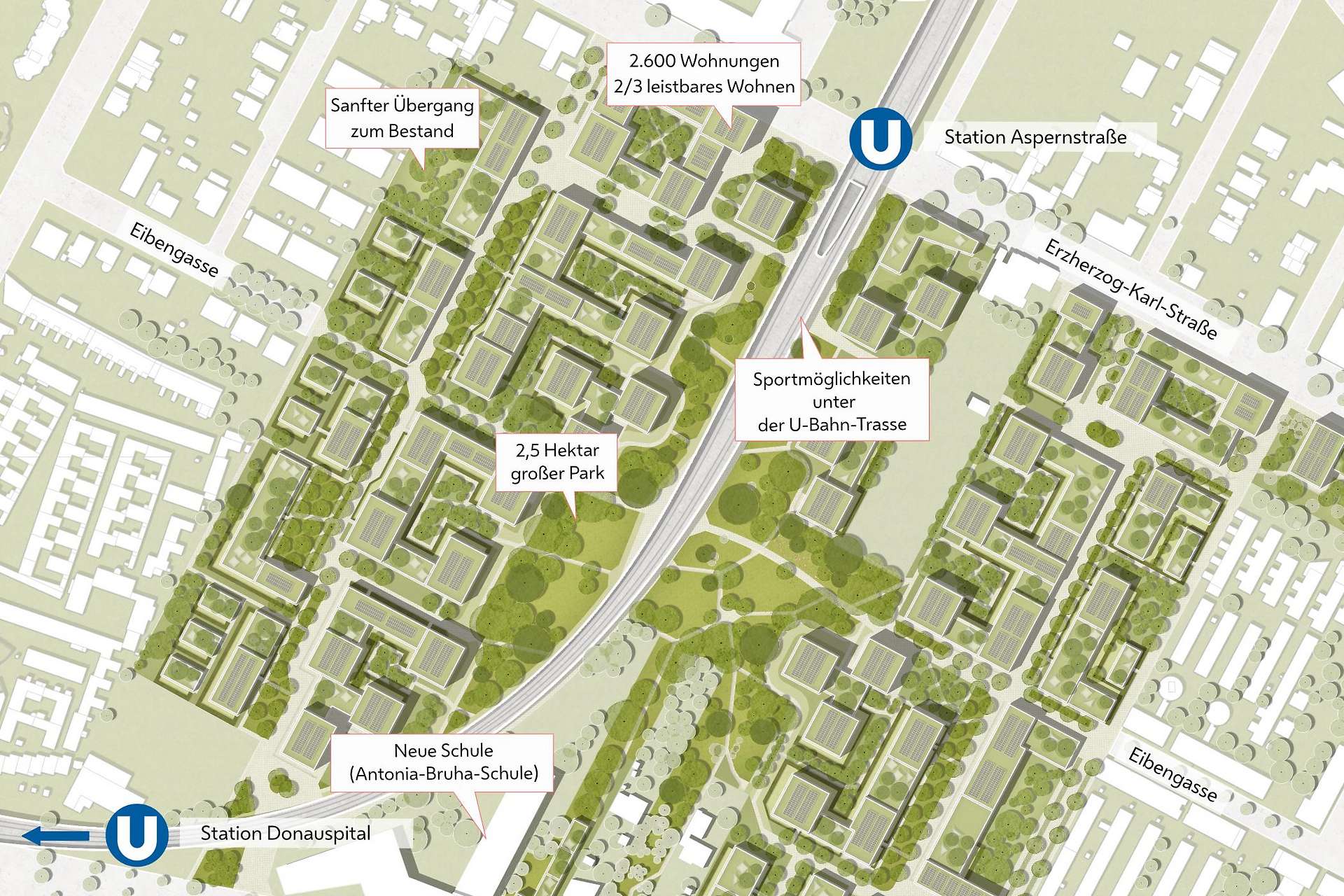 ثلثا هذه الشقق ستُبنى ضمن مشاريع الإسكان المدعوم. وستراعي المباني الجديدة الهياكل المعمارية القائمة في المنطقة، بحيث ستكون المباني الأكثر ارتفاعاً متمركزة في وسط الحي وبالقرب من محطة Aspernstraße. كما سيتم إنشاء مرافق للرياضة والترفيه تحت مسار المترو، لتوفير بيئة محمية من العوامل الجوية.