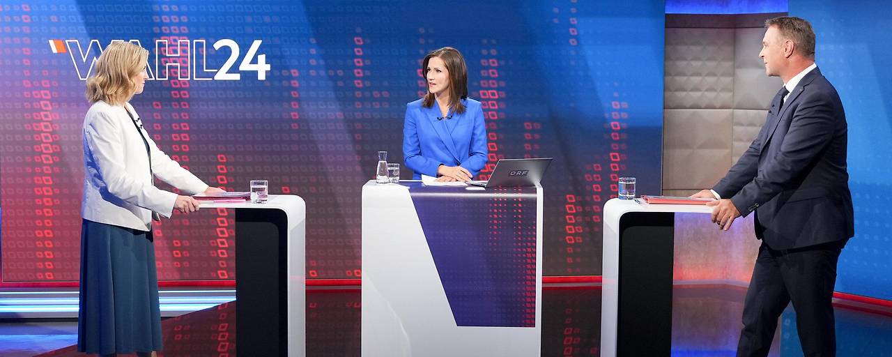 شهدت المناظرات التلفزيونية على قناة ORF يوم الإثنين الجولة الأخيرة، حيث دارت مواجهة بين رئيس الحزب الاشتراكي الديمقراطي (SPÖ) أندرياس بابلر ورئيسة حزب النيوس (NEOS) بيآته ماينل-رايزينجر، وكانت الفوارق في المواقف السياسية بين الطرفين واضحة للغاية، لا سيما في قضايا مثل التقاعد والحياد، ولكن كان هناك توافق حول ضرورة منع قيام ائتلاف بين حزب الشعب النمساوي (ÖVP) وحزب الحرية النمساوي (FPÖ).
